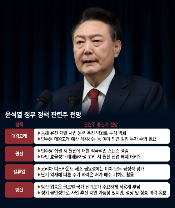 12·3 비상계엄 사태 이후 윤석열 정부가 추진했던 정책 관련주들이 변동성을 키웠다. 정책 지속성에 대한 우려가 확산한 영향이다. 국회에서 윤석열 대통령 탄핵소추안이 가결되면 탄핵 정국 물살이 더 거세질 전망이다. 가결여부는 지켜봐야 하지만 정책 관련주의 매매 여부를 두고 갈팡질팡하던 투자자의 심리가 또다시 요동칠 것으로 예상된다. 해당 종목들의 단기 악화가 예상되는 가운데 중장기 전망은 엇갈린다.