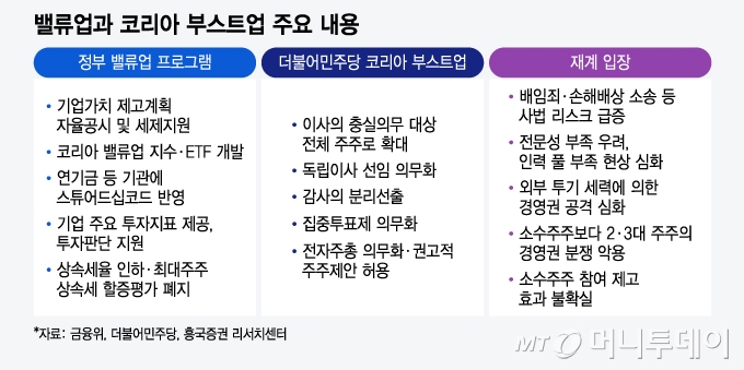 반면 부스트업은 규제와 지배구조 개편에 중점을 뒀다. 이사의 충실의무를 주주로 확대하는 상법개정을 필두로 독립이사 선임 의무화, 감사 분리선출, 집중투표제 활성화, 전자주총 의무화 등을 골자로 한다.