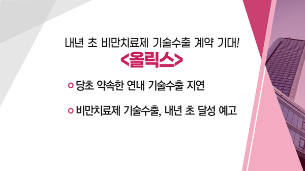 - 비만치료제 기술수출, 내년 초 달성 예고