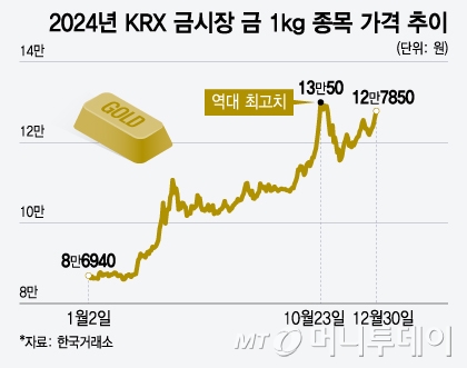 국내 금 시장도 가파른 상승세를 보였다. 1일 한국거래소에 따르면 KRX 금 시장 1kg 종목 가격은 지난달 30일 12만7850원/g에 마감했다. 연초 대비 47% 올랐다. 1kg 종목은 지난해 10월23일 종가 기준 13만50원/g, 100g 종목은 10월30일 13만3050원까지 오르며 역대 최고치를 경신했다. 2024년 총거래량은 25.27톤으로 지난해(12.97톤)의 2배 규모에 달한다.