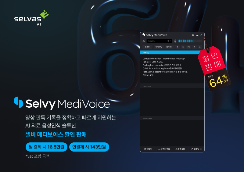 셀바스AI 관계자는 "셀비 메디보이스는 전자의무기록시스템(EMR), 의료영상저장전송시스템(PACS) 내 입력이 필요한 1인 진료기록, 2인 이상의 대면상담 기록 등 다방면으로 음성인식 기술을 제공해 업무 생산성 향상이 가능하다"며 "이번 할인 판매가 반복적인 의료 기록 업무에 비효율화를 느끼는 의료진들이 직접적인 업무 효율화를 경험하는 계기가 됐으면 좋겠다"고 말했다.