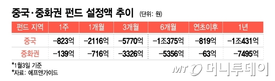 6일 에프앤가이드에 따르면 중국 펀드에서 6개월간 1조375억원(1월3일 기준), 중화권 펀드에서 5356억원이 유출됐다. 최근 1주일부터 1년까지 전 기간에서 자금이 빠져나갔다. 기간별 설정액 감소액은 △1주일 중국 펀드 823억원, 중화권 펀드 139억원 △1개월 중국 펀드 2116억원, 중화권 펀드 716억원 △3개월 중국 펀드 5770억원, 중화권 펀드 3326억원 △1년 중국 펀드 1조431억원, 중화권 펀드 7495억원이다.