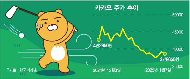 12·3 비상계엄 사태 직후 '정치 관련주'로 묶이며 급등세를 보였던 카카오가 다시 추락했다. 주가가 뛰었던 건 윤석열 정부 들어 압박을 받아온 카카오가 사법 리스크에서 벗어날 수 있다는 기대감 덕이다. 다만 리스크 소멸로 판단하기엔 섣부르다는 게 증권가의 평가다. 주요 사업부의 성장 둔화로 실적이 악화한 점도 부정적이다. 주가 반등을 위해서는 새로운 돌파구가 필요하다.