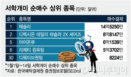 서학개미(해외 주식에 투자하는 개인투자자)들이 연초 들어 테슬라와 양자컴퓨터 관련주 등을 대거 매수한 것으로 나타났다. 도널드 트럼프 미국 대통령 당선인 취임을 앞두고 테슬라의 CEO(최고경영자)인 일론 머스크에 대한 기대감으로 테슬라 투자 열기가 높아졌다. 양자컴퓨터 관련주들도 상위권에 다수 자리했는데 증권가에서는 이들 종목의 변동성을 주의해야한다고 조언한다.
