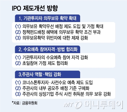 정부가 단기차익 목적이 아닌 기업가치에 기반한 투자를 끌어내기 위한 기업공개(IPO) 시장 개선안을 추진한다. 수요예측 과열을 막고 중장기 투자를 유도하기 위해 의무보유확약을 확대하고 수요예측 참여자격과 방법을 합리화한다. 주관사 역할과 책임은 강화된다.