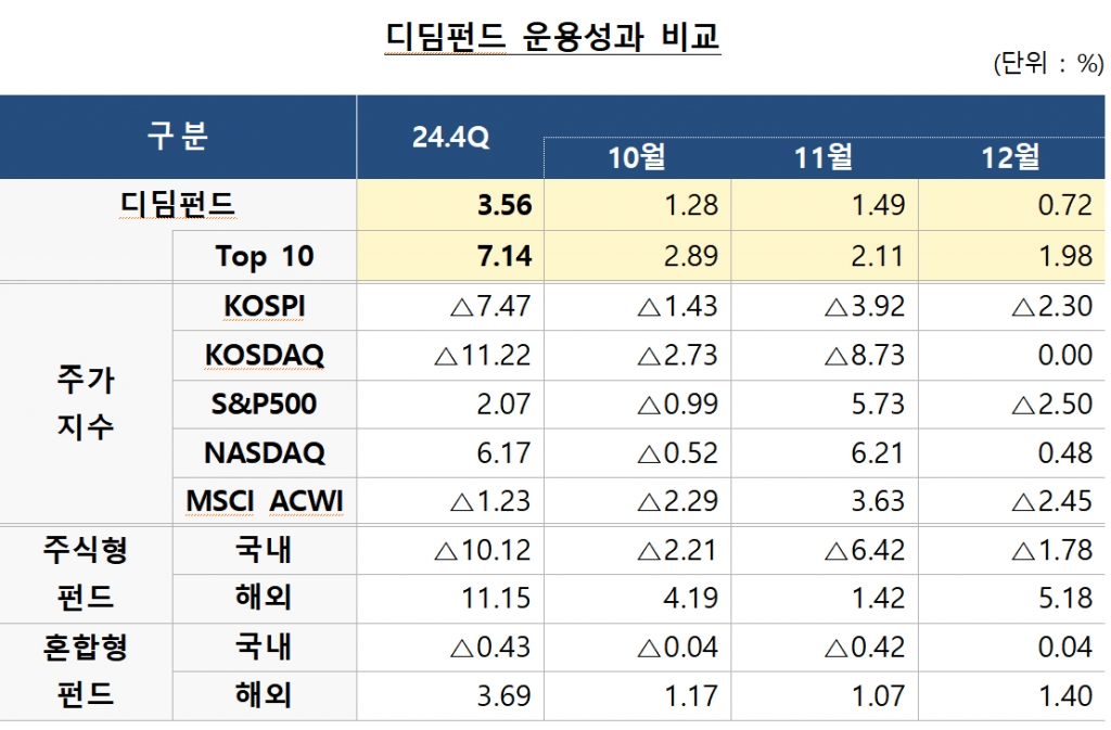 수익률 측면에서도 양호한 운용성과를 보였다. 지난해 9월 펀드 출시 이후 연말까지 25개 전체 디딤펀드의 평균수익률은 3.29%였다. 수익률 상위 10개 펀드는 6.41%를 기록했다. 금투협 관계자는 "지난해 4분기 정치경제적 불확실성이 심화되는 국면에서 국내외 증시는 일부 조정을 받았으나 디딤펀드는 비교적 견조한 성과를 보였다"고 설명했다.