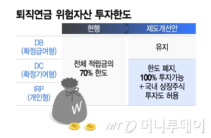 퇴직연금은 확정급여형(DB), 확정기여형(DC), 개인형(IRP)으로 나뉘는데 금융당국은 우선 개인형 퇴직연금에 대해 위험자산 투자한도 폐지를 건의한 상태다. IRP는 가입자 선택에 따라 퇴직일시금이나 따로 자금을 적립해 운용하는 형태이기 때문에 제한을 둘 필요가 없다는 측면에서다. 당국은 근로자가 적립금 운용방법을 결정하는 DC형에 대해서도 단계적으로 개선안이 반영되도록 한다는 계획이다.
