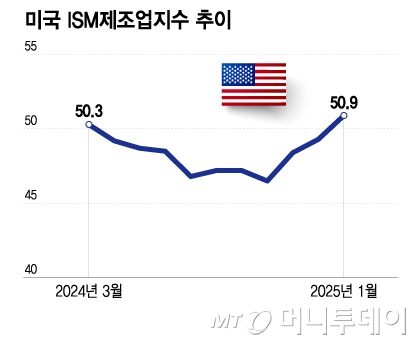 1월 50.9은 전달 49.2보다 1.7포인트 오른 결과이며, 예상치 49.3도 크게 웃돌았다. 지난해 3월 50.3에 이은 10개월만의 제조업 업황 확장 전환이기도 하다. 이보다 이전 ISM제조업지수 50이상은 2022년 10월이었다.