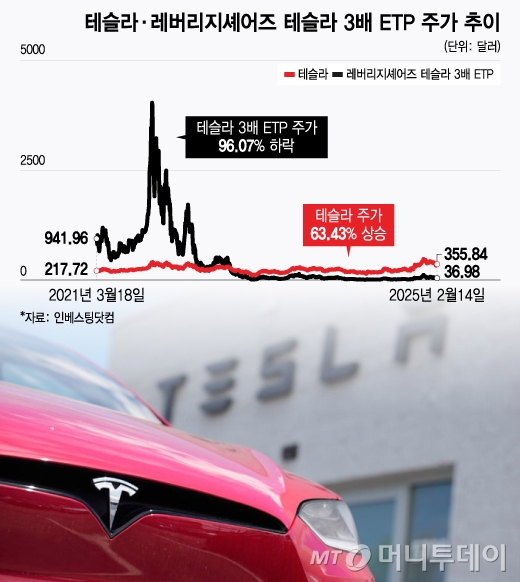 실제로 TSL3는 상장 직후인 2021년 3월18일부터 지난 14일까지 96% 하락했다. 같은 기간 테슬라 주가가 63% 오른 것과 대조적이다. 테슬라 주가가 100달러~400달러대에서 등락을 반복하는 동안 TSL3 주가는 하향세를 그렸다. 연 0.75%인 보수도 누적되면서 주가를 하락시켰다.
