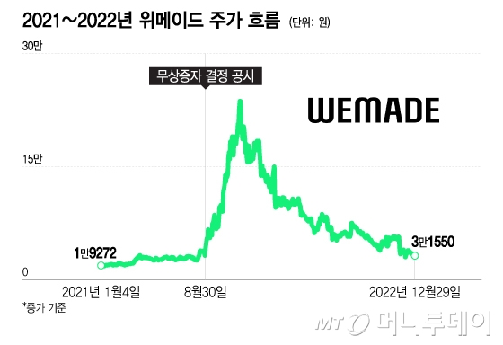 앞서 위메이드는 8월30일 장 마감 후 1주당 신주 1주를 배정하는 무상증자를 결정했다고 공시했다. 위메이드 주가는 8월 초 장중 2만4904원까지 떨어졌다가 11월 말 24만5700원까지 10배 가까이 올랐다.