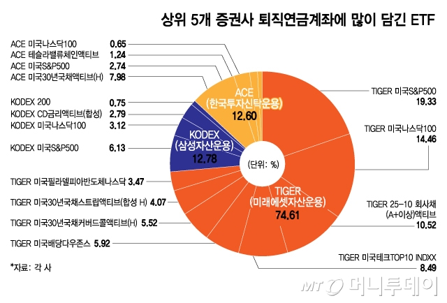 미래에셋의 TIGER ETF는 퇴직연금계좌 ETF 잔고 비중 상위권을 싹쓸이했다. 5개 증권사 퇴직연금계좌 상위권 ETF 중 TIGER ETF 비중만 74.61%에 달한다. 2위는 삼성자산운용의 KODEX ETF(12.78%), 3위는 한국투자신탁운용(한투운용)의 ACE ETF(12.60%)다.