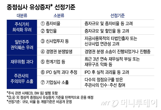 앞으로 금감원은 유상증자 증권신고서가 접수되면 중점심사 유상증자 여부를 확인한다. 크게 △주식 가치 희석화 우려 △일반주주 권익 훼손 우려 △재무위험 과다 △주관사 주의의무 소홀 등 7가지 사유 중 하나에 해당하면 중점심사 대상으로 선정한다. 이후 유상증자 당위성, 주주 소통 절차, 기업실사 내용, 이사회 논의내용 등을 명확히 기재했는지 심사한다. 지정 사유에 대해서는 발생 경위와 회사에 미치는 영향, 대응 방안 등을 충실히 기재했는지 살펴보고 최소 1회 이상 대면 협의를 거칠 예정이다.