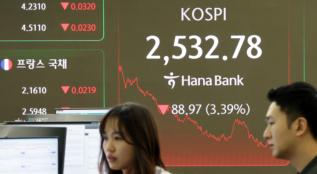28일 코스피 지수는 전일 대비 88.97포인트(3.39%) 내린 2532.78에 마감했다. 코스닥 지수도 26.89포인트(3.49%) 내린 743.96에 마감하며 양대 지수가 동반 급락했다.