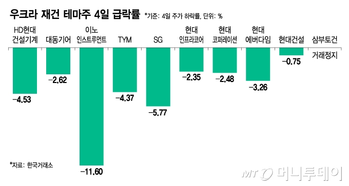4일 한국거래소에 따르면 우크라이나 재건 테마주가 일제히 급락했다. 이날 우크라이나 재건주 중 '맏형'으로 꼽히는 HD현대건설기계(162,700원 ▲4,500 +2.84%)는 3400원 (4.53%) 내린 7만1600원에 거래를 마무리했다. 이 밖에도 SG(2,800원 ▲20 +0.72%)(전 거래일 대비 -5.77%), 이노인스트루먼트(2,925원 ▲270 +10.17%)(-11.6%), TYM(7,110원 ▲30 +0.42%)(-4.37%), 대동기어(21,650원 ▼50 -0.23%)(-2.62%), 현대코퍼레이션(26,850원 ▲450 +1.7%)(-2.48%), 현대에버다임(9,200원 ▲20 +0.22%)(-3.26%), 현대건설(179,500원 ▼3,900 -2.13%)(-0.75%)도 일제히 약세를 보였다.