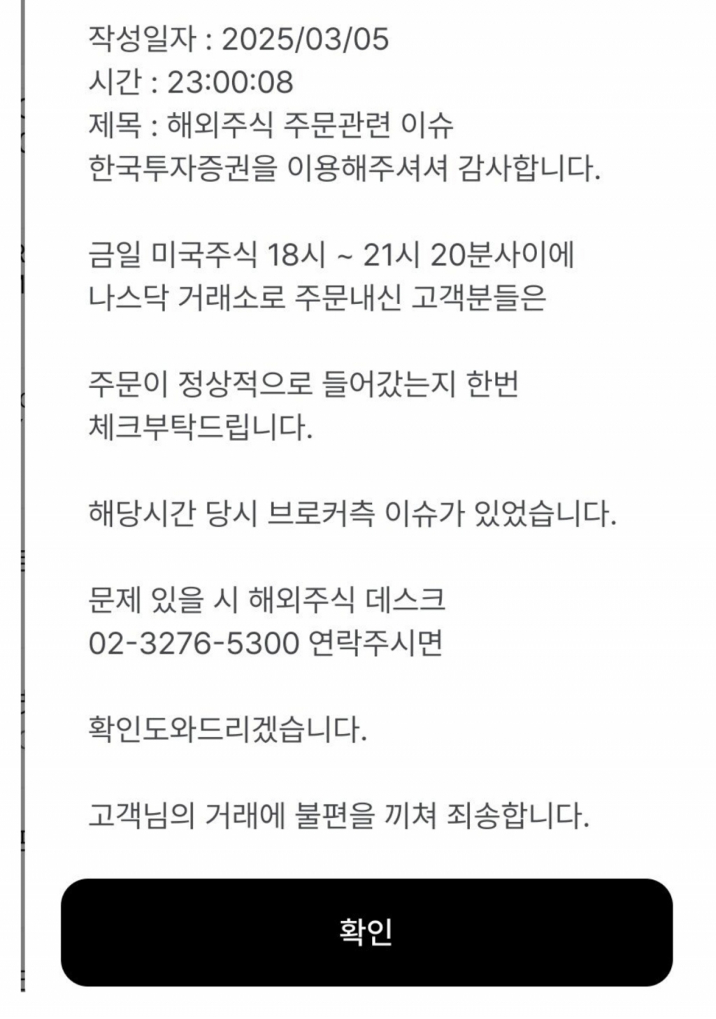 이에 한국투자증권은 전날 밤 고객들에게 안내 메시지를 통해 이날 오후 6시 미국주식 18시에서 밤 9시20분 사이에 나스닥 거래소로 주문을 낸 고객들은 주문이 정상적으로 들어갔는지 확인해 달라고 부탁했다.