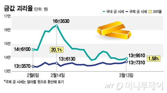 지난달 14일 KRX금시장 종가 기준 괴리율은 20.1%로 장중에는 24%까지 오르기며 최고치를 찍었다. 이후 차익 실현 매물이 나오며 국내 금값은 하락세를 이어갔고 이날 기준 국내외 금값 괴리율은 1.5%를 기록했다. 금 괴리율이 정상화되는 과정에서 국내 급값은 한 달 동안(2월14일~3월13일) 14% 떨어졌지만 같은 기간 국제 금값은 0.87% 오르는 등 변동 폭이 작았다.