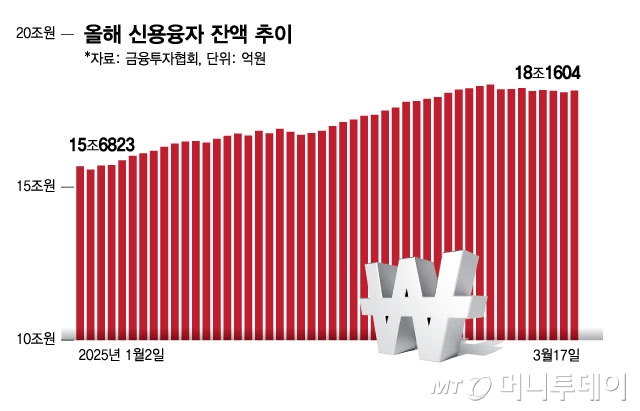 지난해 말 비상 계엄으로 인한 정치 리스크 등 투자 심리 악화로 증시가 부진하자 신용융자잔액은 15조1632억원(12월12일)으로 연중 최저치를 찍었다. 당시 규모와 비교하면 3조원 가까이 불어난 셈이다. 신용융자잔고는 빚투 규모를 가늠할 수 있는 지표로 규모가 증가하고 있다는 것은 공격적인 투자가 늘어나는 것으로 해석된다.