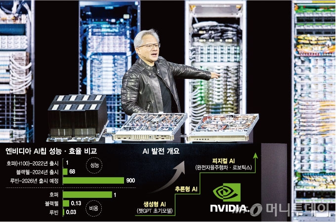 내년 하반기 나올 루빈은 블랙웰에 장착한 자체 개발 CPU(중앙처리장치) 그레이스 대신 새로운 CPU '베라'를 결합해 성능을 블랙웰 울트라 대비 3.3배 더 끌어올린다. 황 CEO는 "데이터센터 기준으로 루빈은 호퍼보다 성능은 900배 향상되고 비용은 3%로 줄어들 것"이라고 말했다.