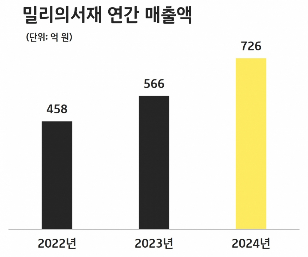 독서 플랫폼 밀리의서재(14,710원 ▲1,150 +8.48%)가 지난해 연간 매출 726억원, 영업이익 110억원을 달성했다고 21일 밝혔다. 전년 대비 각각 28.3%, 5.8% 증가했다.