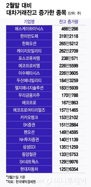 머니투데이가 지난 2월28일부터 이달 21일까지 예탁결제원 대차거래잔고 자료를 분석한 결과에 따르면 이 기간에 대차거래잔고가 가장 많이 증가한 종목은 SK하이닉스(893,000원 ▲86,000 +10.66%)다.