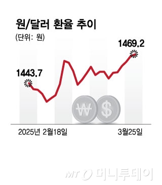 최근 원달러환율은 최근 한달간 1430원대 중반에서 1470원 턱밑까지 가파르게 상승했다. 정치적 불확실성이 고조되고 상호관세 부과 우려가 가중되며 오름 폭을 키우고 있다. 특히 탄핵 심판 선고가 예상보다 늦어지면서 변동성이 커지는 모습이다.