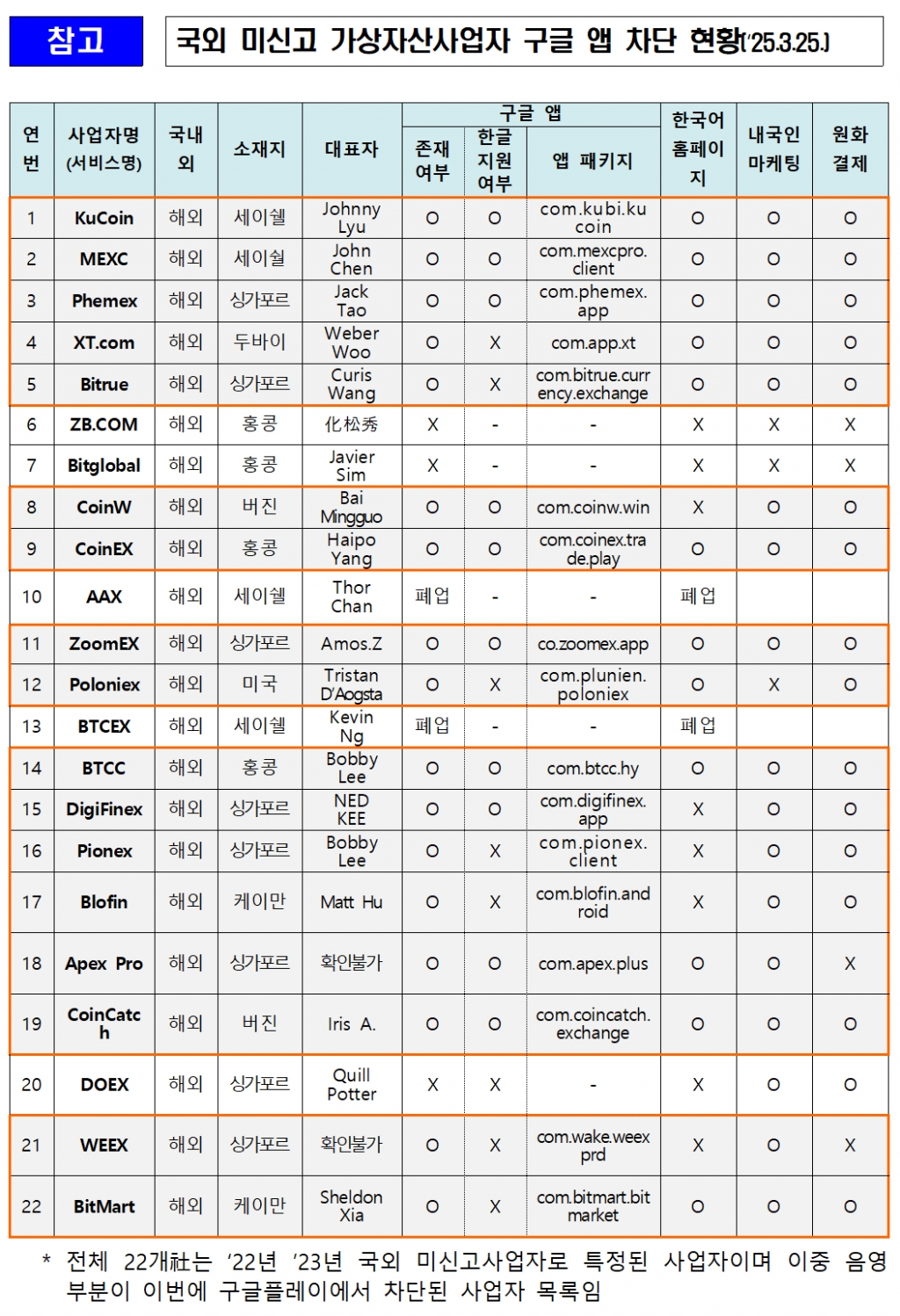 금융위 FIU는 구글LLC에 요청해 구글플레이 앱 마켓에 등록된 해외 미신고 가상자산사업자 17개사 앱에 대해 지난 25일부터 국내 접속을 차단했다고 26일 밝혔다.