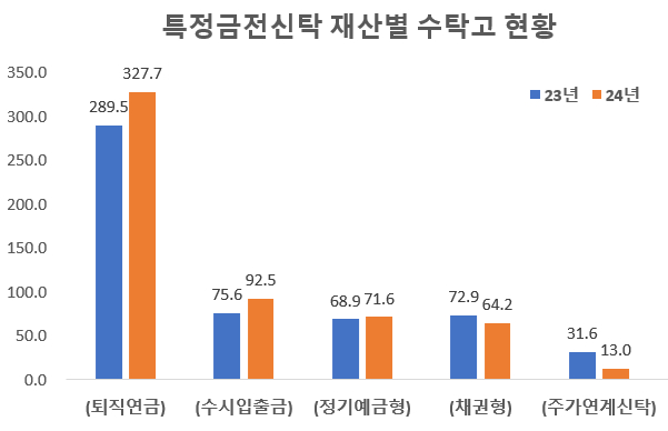 금전신탁에서 퇴직연금 증가액이 가장 컸다. 지난해 말 기준 퇴직연금 수탁고는 327조7000억원으로 전년보다 38조2000억원 증가했다. 이어 수시입출금(16.9조원), 정기예금형(2.6조원)이 전년대비 늘었다. 채권형(△8.7조원)과 주가연계신탁(△18.6조원)은 감소했다.