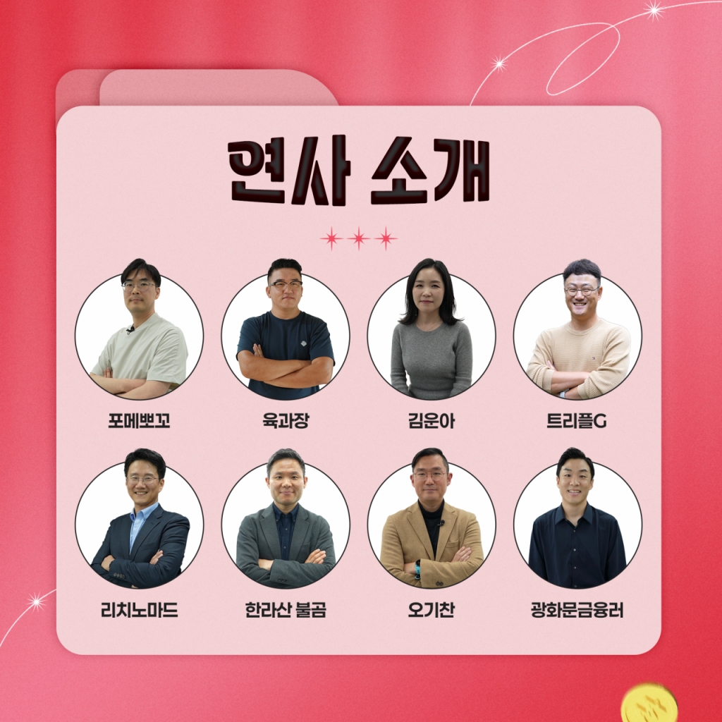또, 주식투자로 30억원대 자산가가 된 '포메뽀꼬', 15만 구독자를 보유한 주식 전문강사 '광화문금융러'가 연령별 주식 투자, 세금 최적화 주식투자법 등을 알려드리고 재테크 필독서 '돈은 모든 것을 바꾼다'의 저자 '김운아' 작가, 30대에 경제적 자유를 이룬 '육과장' 연금투자 전문가인 오기찬 작가도 출연합니다.