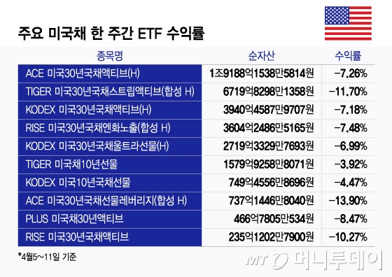 14일 금융투자업계 등에 따르면 국내 증시에 상장한 미국 국채 관련 ETF(상장지수펀드)들은 지난 한 주간 수익률이 크게 부진했다. 레버리지 상품인 ACE 미국30년국채선물레버리지(합성 H)가 13.9% 하락했다. TIGER 미국30년국채스트립액티브(합성 H)와 RISE 미국30년국채액티브가 각각 11.7%, 10.3% 하락했다. TIGER 미국채10년선물, KODEX 미국10년국채선물 등 10년물 상품들도 각각 3.9%, 4.5% 하락했다.