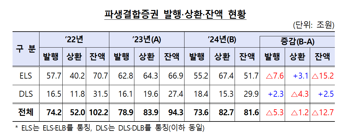 금융감독원이 22일 발표한 '2024년 중 증권회사 파생결합증권 발행·운용 현황'에 따르면 지난해 파생결합증권 발행액은 전년대비 5조30000억원 감소한 73조6000억원, 상환액은 1조2000억원 줄어든 82조7000억원으로 상환액이 발행액을 웃돌았다.