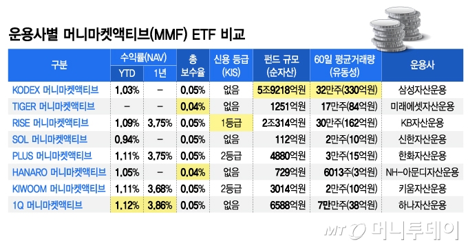 총 보수율이 가장 저렴한 상품은 미래에셋자산운용의 TIGER 머니마켓액티브와 HANARO 머니마켓액티브다. 두 상품 모두 총 보수율이 0.04%다. 나머지 6종은 총 보수율이 0.05%로 동일했다.