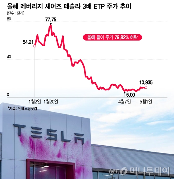 만약 테슬라 레버리지 상품의 투자자가 포지션을 그대로 유지했다면 큰 손실을 봤을 것으로 추정된다. 주가 하락에 더해 원/달러 환율은 지난 1월1일부터 4월30일까지 3.53% 내려, 환 손실까지 더하면 투자 손실은 더 커졌을 것으로 보인다.