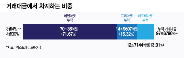 796개 종목으로 확대되기 전인 지난 3월28일까지 프리·애프터마켓의 전체 거래 비중이 약 16% 수준에 그쳤다. 다만 지난달 30일 기준 NXT 전체 누적 거래대금(97조6786억원)에서 프리마켓(15.32%)과 애프터마켓(13.01%)이 28.3%를 차지하면서 한달 사이 12% 이상 늘었다.