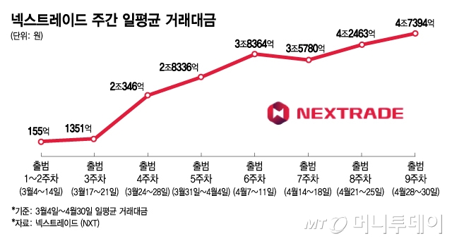 5일 NXT에 따르면 지난달 28일부터 30일까지 NXT 거래대금은 총 14조2183억원으로 일평균 4조7394억원으로 집계됐다.