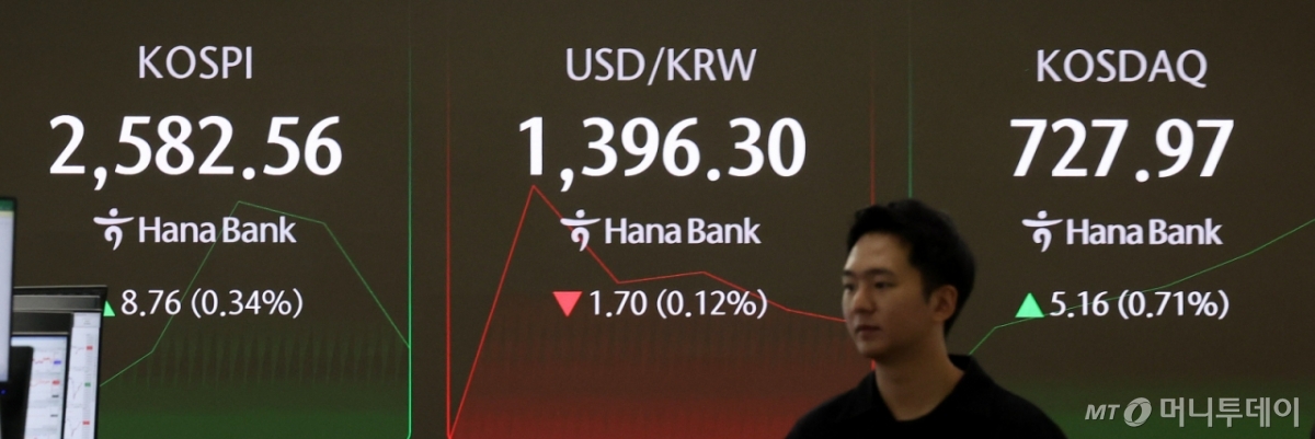 ![[서울=뉴시스] 추상철 기자 = 코스피와 코스닥지수가 상승 출발한 8일 오전 서울 중구 하나은행 딜링룸 전광판에 지수가 표시되고 있다.코스피는 전 거래일 대비 7.47포인트(0.29%) 오른 2581.27에, 코스닥지수는 3.0포인트(0.42%) 오른 725.81에 장을 시작했다. 2025.05.08. scchoo@newsis.com /사진=추상철](https://thumb.mt.co.kr/cdn-cgi/image/f=avif/21/2025/05/2025050809304796086_1.jpg)