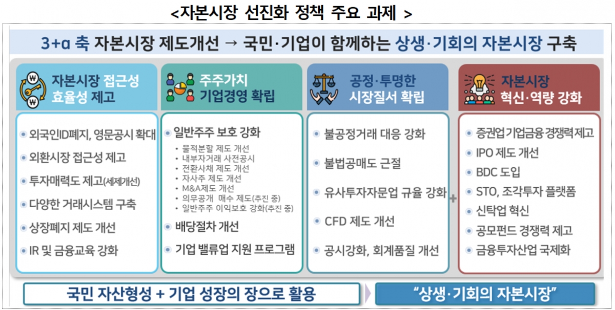 정부가 추진하는 4가지 자본시장 제도개선 과제로는 △접근성·효율성 제고 △일반주주 이익보호 △공정·투명한 시장질서 △자본시장 혁신·역량 강화 등이다.