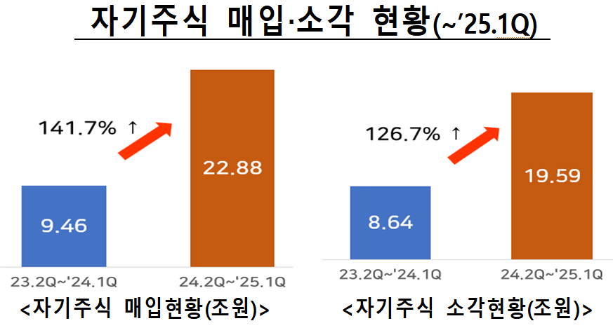 자본시장 혁신·역량 강화 부분은 증권업 기업금융 경쟁력 제고와 토큰증권(STO) 조각투자 플랫폼 제도화, 신탁업 활성화 방안을 발표하고 추진 중이다. 자본시장 선진화 노력으로 기업의 자기주식 매입액은 2023년 2분기부터 1년간 9조4600억원에서 2024년 2분기부터 1년간 22조8800억원으로 늘었고, 같은기간 자기주식 소각은 8조6400억원에서 19조5900억원으로 증가했다. 이런 노력으로 지난해 10월 세계국채지수(WBGI)에 편입됐고 MSCI(모건스탠리캐피털인터내셔널) 선진국 지수 편입에 도전하고 있다.
