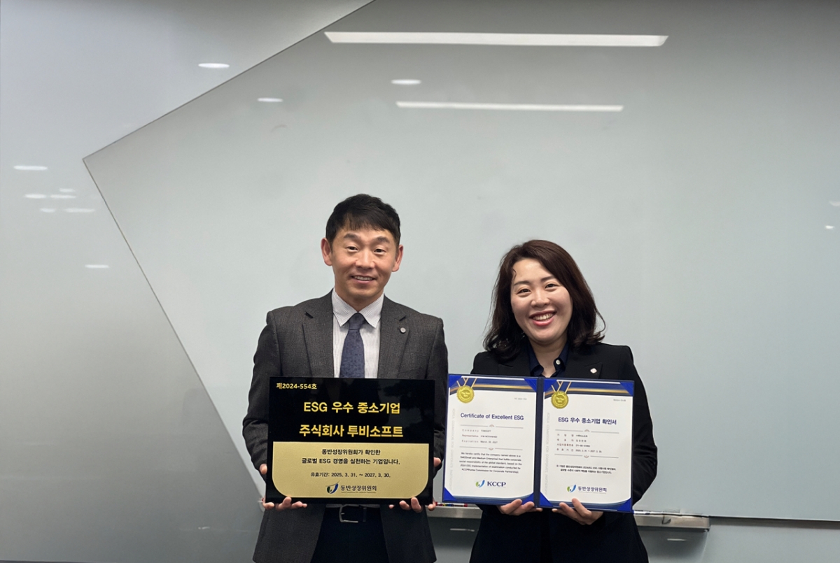 동반성장위원회는 ESG 우수 중소기업으로 선정된 투비소프트에 확인서와 현판을 수여했으며 향후 △금융 지원 △수출 지원 △R&D(연구·개발) 지원 △환경 컨설팅 및 자금 지원 등 다양한 혜택을 제공할 계획이다.