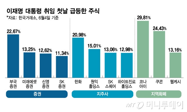 이재명 제21대 대통령 취임 첫날인 4일, 증시에서 신정부 수혜 주로 꼽히는 종목이 급등했다. 신고가도 속출했다. 이 대통령은 선거 과정에서 "1400만 개미와 코스피 5000시대를 열겠다"라고 공언하고, 지방분권을 강조했다. 이에 증권, 지주사, 지역화폐 관련 종목이 시장의 주목을 받았다.