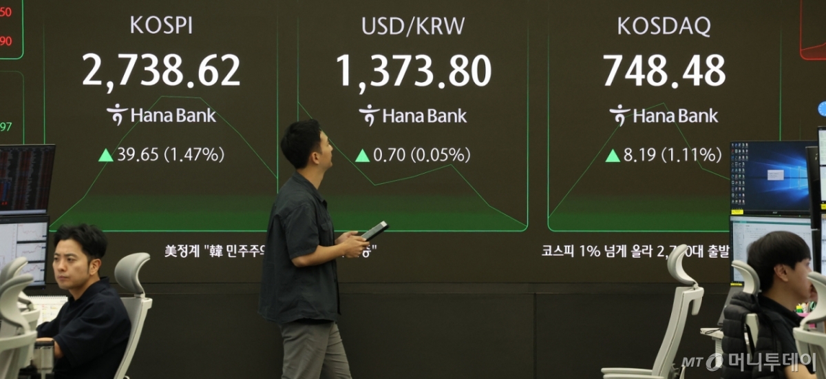 ![[서울=뉴시스] 김선웅 기자 = 이재명 정부가 출범한 4일 코스피가 전 거래일(2698.97)보다 38.95포인트(1.44%) 오른 2737.92, 코스닥 지수는 전 거래일(740.29)보다 8.84포인트(1.19%) 상승한 749.13에 거래를 시작했다. /사진=김선웅](https://thumb.mt.co.kr/cdn-cgi/image/f=avif/21/2025/06/2025060411315315751_1.jpg)