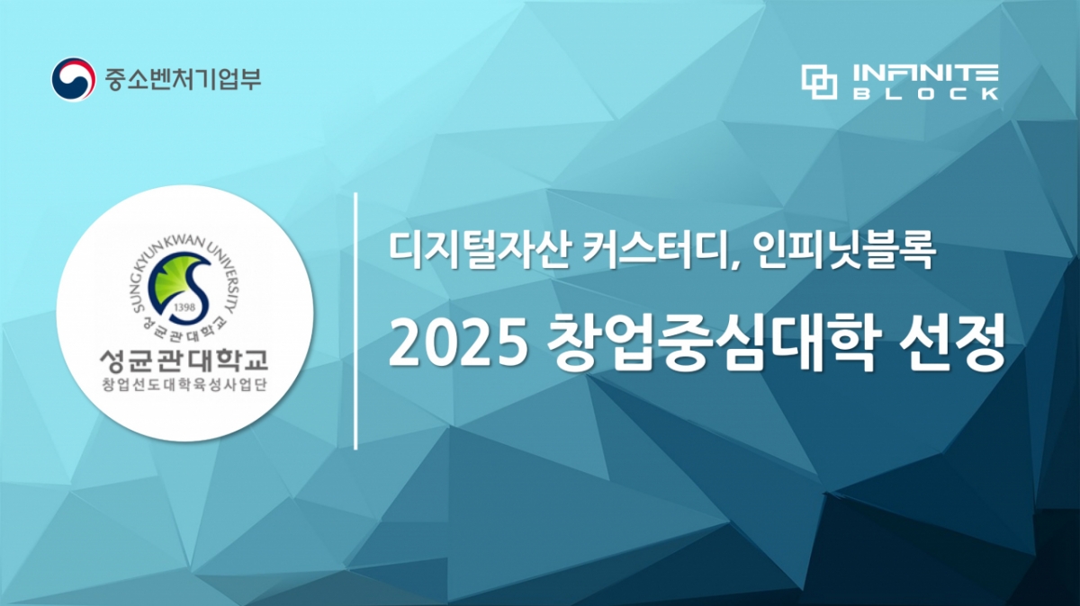 인피닛블록이 중소벤처기업부가 주관하고 성균관대학교 창업지원단이 운영하는 '2025년 창업중심대학' 지원 사업에 최종 선정됐다고 5일 밝혔다.
