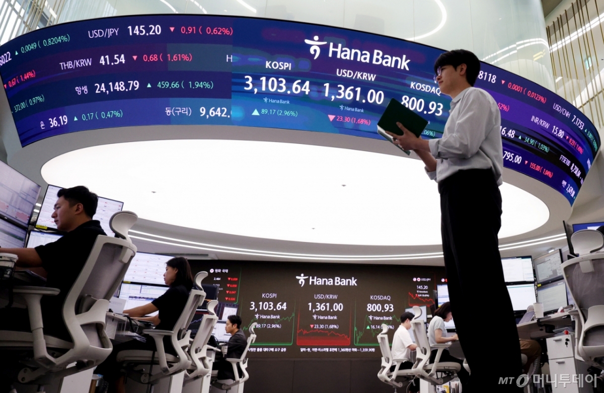 ![[서울=뉴시스] 김진아 기자 = 코스피 3년 9개월 만에 3,100선 회복한 24일 서울 중구 하나은행 딜링룸에서 딜러들이 업무를 보고 있다. 코스피는 전 거래일(3014.47)보다 89.17포인트(2.96%) 오른 3103.64에, 코스닥 지수는 전 거래일(784.79)보다 16.14포인트(2.06%) 상승한 800.93에 거래를 종료했다. 2025.06.24. bluesoda@newsis.com /사진=김진아](https://thumb.mt.co.kr/cdn-cgi/image/f=avif/21/2025/06/2025062508594926758_1.jpg)