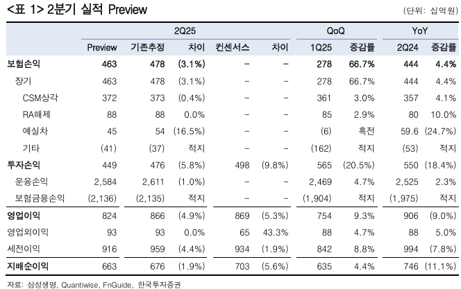 홍 연구원은 2분기 지배순이익은 6634억원으로 컨센서스를 6% 하회할 것으로 추정했다. 일회성 요인소멸과 자회사 연결효과 감소로 투자손익이 전년동기대비 부진할 것으로 봤다. 보험손익은 전년동기대비 4.4% 증가한 4633억원을 기록할 전망이다. CSM 상각익은 3718억원으로 전년동기대비 4.1% 늘었다. 이경우 해당 수치와 예상치와의 차이는 449억원으로 전년동기대비 24.7% 감소한다. 영업 확대로 보험금 지급이 증가해서다. 투자손익은 같은 기간 18.4% 감소한 4486억원으로 추정했다. 전년 동기에 반영됐던 부동산 매각익과 삼성카드 호실적 효과가 올해 2분기에는 없다.