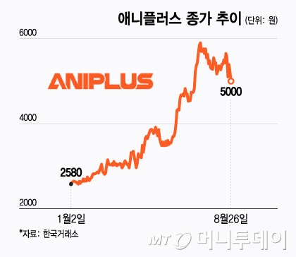 이날에도 전거래일 대비 4.21% 하락한 5000원에 장을 마쳤다. 전날 3.15% 하락한 데 이어 2일 연속 하락세다. 애니플러스 주가는 올해 초 2580원으로 시작해 이미 2배 올랐다. 상당수 차익실현 매물이 나올 수 있는 시점이라는 평가다.