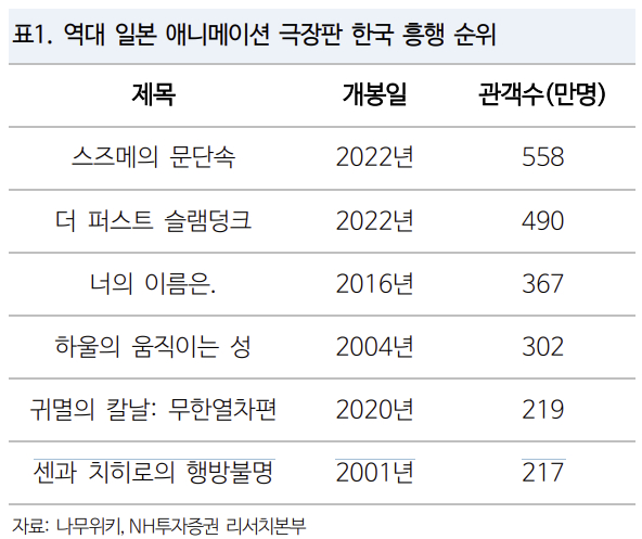 이제 관심은 일본 애니메이션 역대 최다 관객 수를 동원하느냐다. 지금까지 국내 최다 관객 작품은 2023년 3월 개봉한 '스즈메의 문단속'으로 558만명이다. 뒤를 이어 같은해 1월 개봉한 '더 퍼스트 슬램덩크'가 490만명, 3위가 2017년 367만명의 '너의 이름은', 4위가 2004년 개봉해 302만명이 본 '하울의 움직이는 성', 5위가 2021년 219만명을 동원한 '귀멸의 칼날: 무한열차편' 순이다. '귀멸의 칼날' 2편을 합하면 '너의 이름은'을 넘어 '슬램덩크'를 위협하는 수준이다.