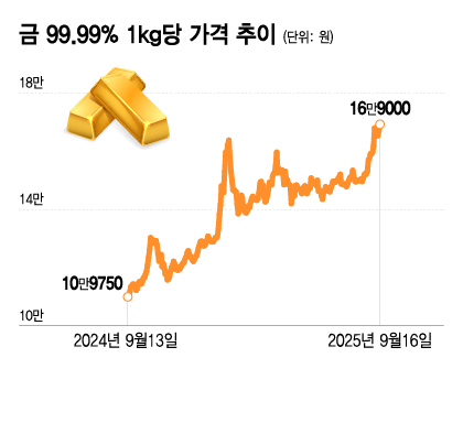 국제 금값이 요동치자 국내 시세도 동반 급등하고 있다. 16일 한국거래소 금 시장에서 금 99.99% 1kg은 g당 16만9000원에 마감해 사상 최고가를 기록했다.