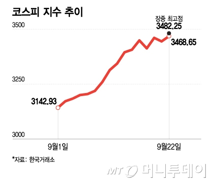이날 코스피 지수는 코스피 23.41포인트(0.68%) 오른 3468.65에 장을 마감했다.앞서 장중 3480선(3482.25)을 돌파하며 사상 최고치를 경신했다.