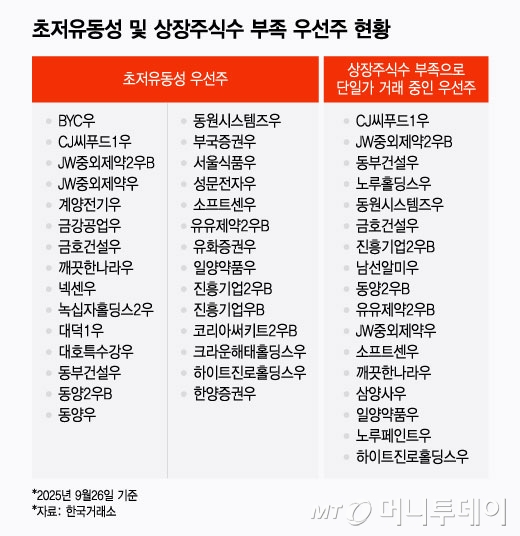 거래소에 따르면 9월 기준 유동성이 극히 낮은 초저유동성 종목은 34개로 이중 85%에 달하는 29개 종목이 우선주인 것으로 나타났다. 유가증권시장 규정상 반기 월평균 거래량이 1만주 미만인 경우 상장폐지 요건에 해당한다.