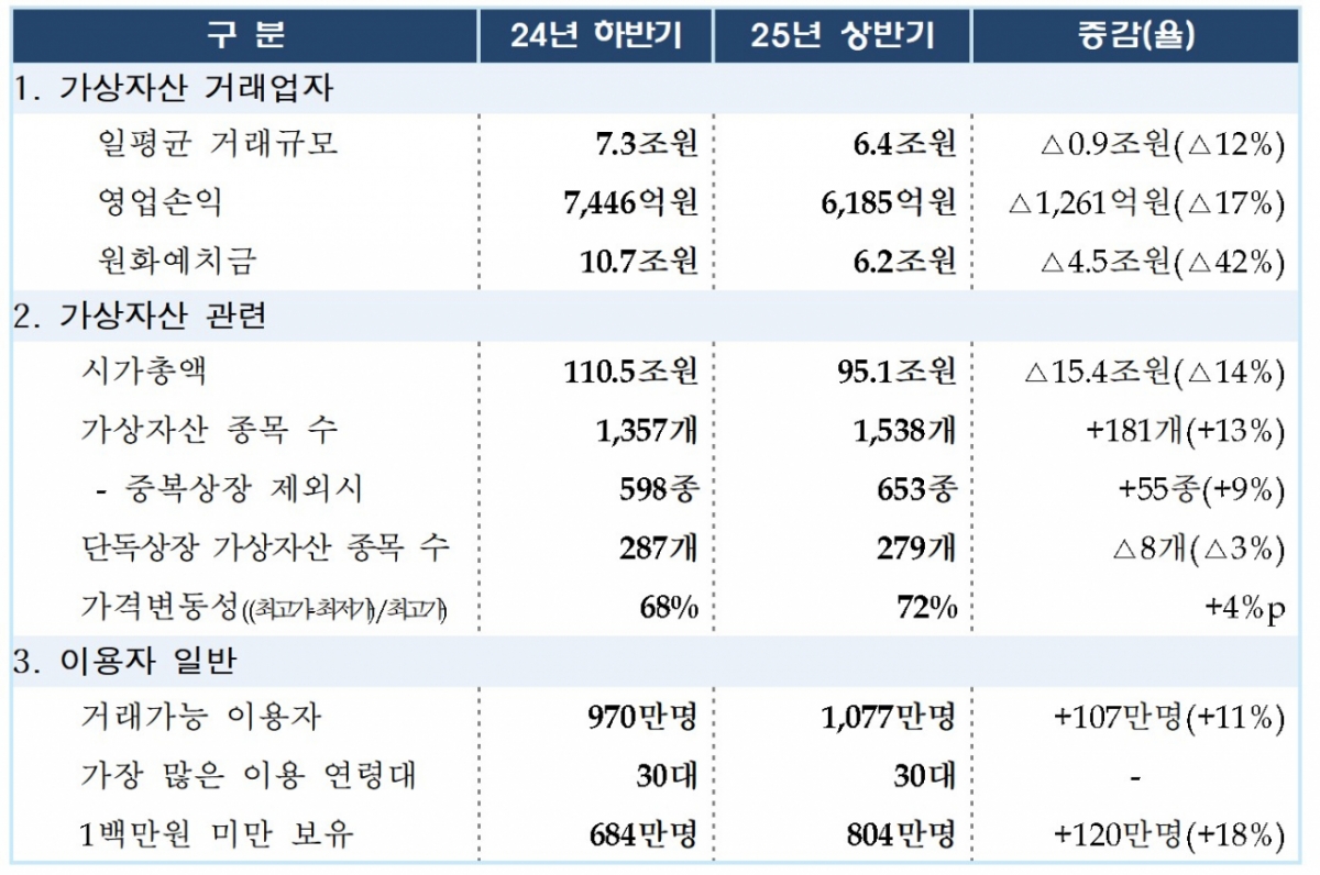 금융당국은 "글로벌 관세 갈등과 지정학적 긴장고조 등으로 전년대비 시장 상승세가 둔화하고 변동성이 확대됐다"며 "해외 기관의 투자 확대로 비트코인 가격은 상승했지만 개인 투자심리 약화로 다른 가상자산 가격은 혼조세를 보인다"고 평가했다.