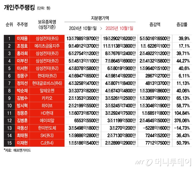 2위는 메리츠금융지주(112,300원 ▲600 +0.54%)의 조정호 회장이다. 지분평가액은 11조1138억원으로 17.1% 늘었다. 정몽구 현대차그룹 명예회장과 정의선 현대차그룹 회장은 각각 6, 7위로 약 4조원대 주식을 보유했다. 현대차(471,000원 ▲5,500 +1.18%)는 미국 관세 협상에서 피해주로 부각된 영향으로 이들 증감률은 각각 6.11%, 11.13%에 그쳤다.